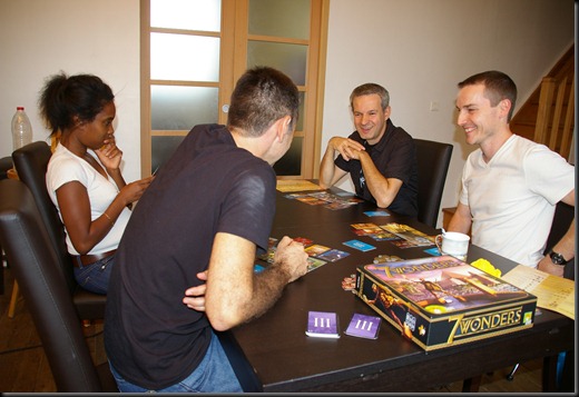 Après Norenberc et une petite pause goûter, nous décidons de jouer à 7 WONDERS. Le jeu du moment !!! Celui qui rafle tous les prix ludiques de l’année !!! C’est vrai qu’il est facile d’accès, les parties sont courtes, on peut y jouer jusqu’à 7 et surtout c’est un jeu intéressant avec une mécanique de jeu très simple.